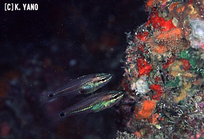 カブラヤテンジクダイと同じく深場に生息するテンジクダイで、生息深度は50m前後と深い。スカシテンジクダイ程の大きさで、吻端から始まる2本の縦帯と尾柄の黒点が特徴。最近日本初記録種として記載されたばかりで、ニセフタスジイシモチという和名が付けられた。('99.1.20 キャプション更新)